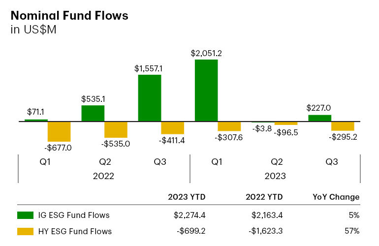 - In 2023 YTD, both Investment Grade (IG) and High Yield (HY) ESG nominal fund flows have outperformed the prior year.
