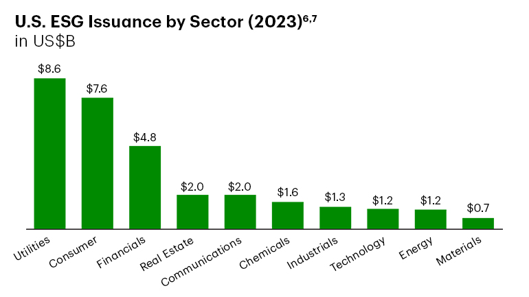 - Energy-intensive sectors (including Utilities, Chemicals, Industrials, Energy, and Materials) have accounted for 44% of U.S ESG bond supply in 2023 (vs 46% in 2022), indicating stickiness from such issuers