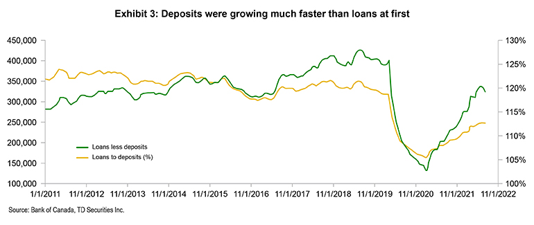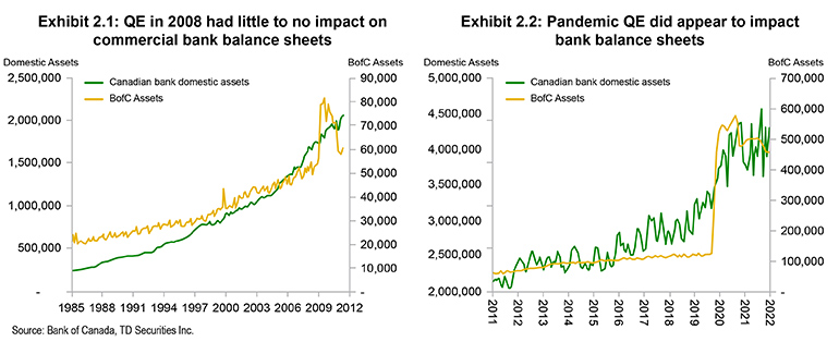 - In pandemic QE, central banks purchased securities outside the banking sector which created deposits within the banking sector. The banks are sitting on significantly more assets and deposits in Canada and the U.S. than they were before the pandemic.