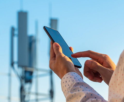 Close up of a person tapping their smartphone screen with cell phone towers in the background.
