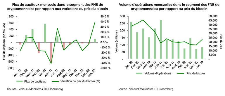 Après avoir affiché des rentrées de fonds durant onze mois depuis leur création, les FNB de cryptomonnaies ont enregistré leur première sortie de capitaux mensuelle en janvier 2022, à la suite d’une baisse de 17 % du prix du bitcoin. Les flux de capitaux sont revenus au vert en février et en mars en raison du rebond des marchés, mais ils sont rapidement encore passés au rouge en avril, du fait de la baisse des cours. En juin 2022, les sorties de capitaux des FNB de cryptomonnaies on atteint un sommet, après une chute de 41 % du bitcoin et de 48 % de l’ether. Au deuxième semestre de 2022, l’intérêt pour les FNB de cryptomonnaies a fortement fléchi, ce qui a entraîné une diminution des flux de capitaux au cours de cette période. En janvier 2023, les FNB de cryptomonnaies n’ont enregistré que de faibles rentrées de fonds, et ce, malgré la flambée de 39 % du prix du bitcoin. Il y a lieu de croire que les investisseurs se montrent prudents à l’égard des cryptoactifs.
