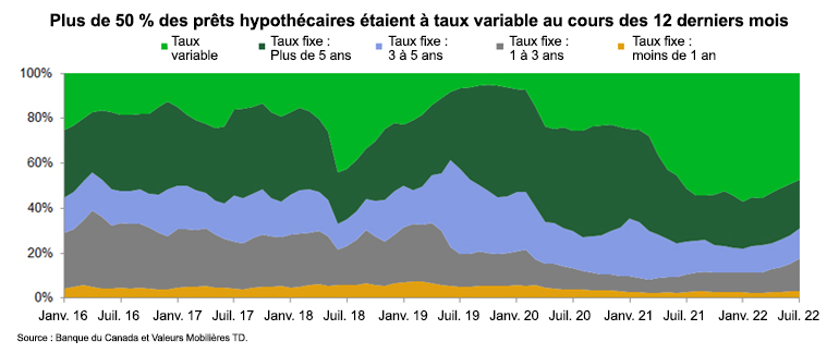 En utilisant des hypothèses simplificatrices, nous estimons que 52 % des prêts hypothécaires résidentiels seront partiellement exposés à des taux plus élevés au cours des 12 prochains mois. Cela comprend 489 milliards de dollars de prêts à taux variable, dont la plupart ont des versements fixes (jusqu’à un certain seuil), ainsi que 27,5 % (262 milliards de dollars) de prêts hypothécaires à taux fixe en cours. Étant donné que le taux moyen à l’origine de ces prêts fixes se situe autour de 3,2 %, ceux qui renouvelleront des prêts hypothécaires à taux fixe au cours des 12 prochains mois seront confrontés à un choc de taux d’intérêt important.
