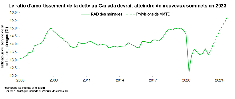 La combinaison des renouvellements de prêts hypothécaires à taux fixe et de la possibilité d’une hausse des versements à taux variable entraînera une forte augmentation des paiements de la dette totale l’année prochaine, le ratio d’amortissement de la dette devant atteindre de nouveaux sommets au milieu de 2023. Cette situation, conjuguée au choc de l’inflation et à l’érosion de la confiance des ménages, constituera un obstacle important pour les perspectives de consommation en 2023 et par la suite.