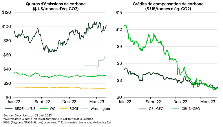 Le G7 a publié une déclaration sur les principes des marchés du carbone de haute intégrité. Bien que le document soit général, il reconnaît le rôle important que jouent des marchés du carbone crédibles dans l’atteinte des objectifs mondiaux de réduction des émissions. La déclaration souligne l’importance de favoriser l’intégrité de l’offre, de la demande et du marché au sein du marché volontaire du carbone et salue les initiatives des parties prenantes indépendantes. L’administration Biden a également lancé un défi sur la gestion du carbone lors du Forum des grandes puissances économiques. Cette nouvelle initiative vise à encourager les pays à faire des annonces lors de la COP 28 qui accéléreront les technologies de séquestration géologique du dioxyde de carbone et d’élimination du carbone. Les participants du Forum des grandes puissances économiques, soit l’Australie, le Canada, l’Égypte, l’Union européenne, le Japon, le Royaume d’Arabie saoudite, les Émirats arabes unis, les États-Unis, la Norvège et le Danemark, se sont joints au lancement du défi. La Chine et l’Inde constituent des exceptions notables.
