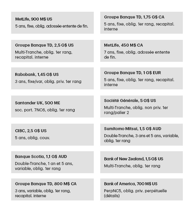 Dans un contexte macroéconomique et géopolitique mondial incertain en ce début de 2022, de nombreuses institutions financières ont voulu tirer profit des conditions de financement historiquement attrayantes, soutenues par un solide contexte de crédit. Par conséquent, le mois de janvier 2022 a été marqué par des émissions records d’environ 110 G$ US sur le marché des obligations de sociétés de catégorie investissement libellées en dollars américains seulement.