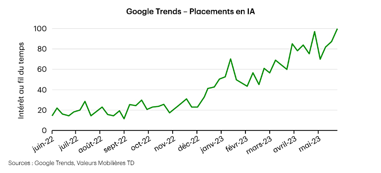 Investir dans l’intelligence artificielle (IA) est devenu une idée populaire. Les données de Google Trends montrent que les recherches sur les placements liés à l’IA se sont fortement multipliées cette année. Cette tendance augmente depuis longtemps, un mouvement qui s’est accéléré avec le lancement de ChatGPT, qui a avivé l’intérêt pour l’IA. Depuis ce lancement le 30 novembre 2022, l’un de ses principaux promoteurs a affiché une hausse de 32 % de son cours. Un important fournisseur de matériel informatique IA a plus que doublé son cours sur 12 mois. Le secteur des technologies a également profité de cette tendance, l’indice S&P 500 ayant enregistré une croissance de 42 % depuis le début de l’année.