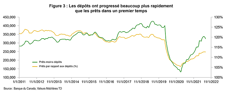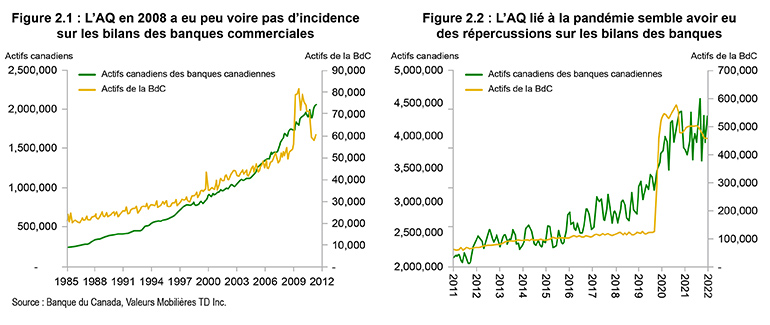 - Dans le cas de l’AQ lié à la pandémie, les banques centrales ont acheté des titres en dehors du secteur bancaire, ce qui a engendré des dépôts au sein du secteur bancaire. Au Canada et aux États-Unis, les banques détiennent désormais beaucoup plus d’actifs et de dépôts qu’avant la pandémie.